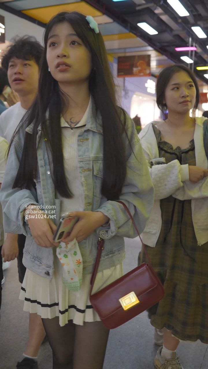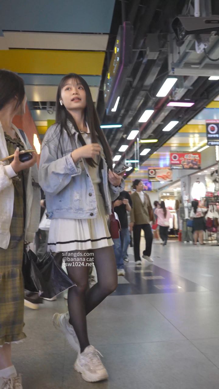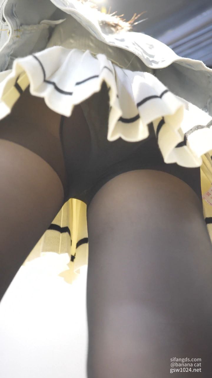 街拍抄底 黑长直美女穿网球裙配黑丝袜 挑饰品被抄底花格子内内