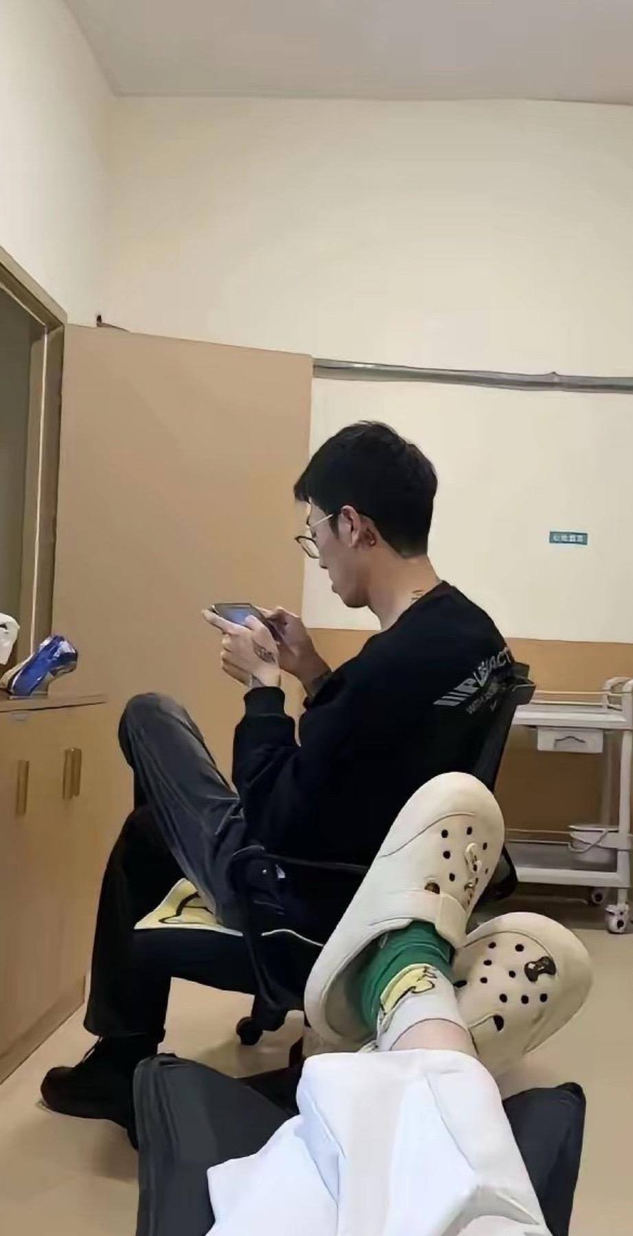 一名手臂上刻满纹身的男子穿着便服,在护士站内帮她搬货、揉肩,还在护士台上帮她写报告,还帮她配药给点滴瓶贴标签。