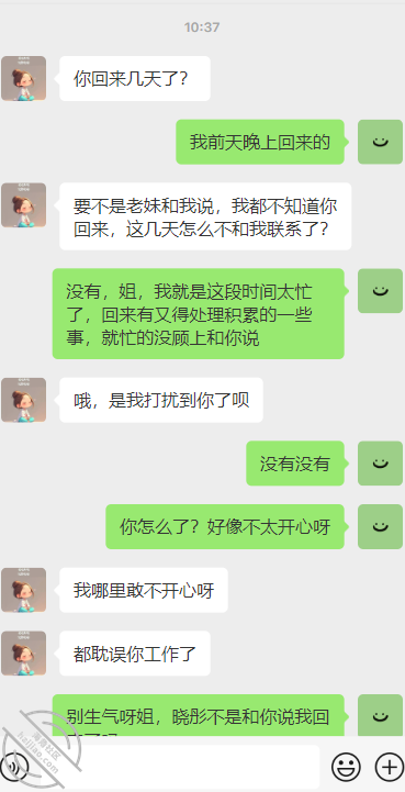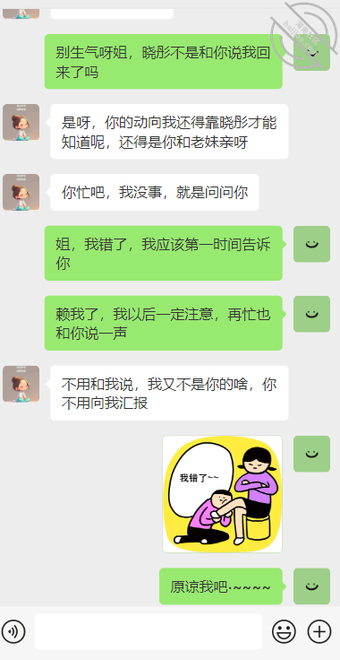 我说我前天晚上回来的,雪姐就生气了,总体的思想我总结一下就是我这几天一直没有和雪姐联系,让雪姐担心了,而且我回来的信息她还是问老妹儿才知道的。怎么说呢,可能雪姐感觉她没有晓彤和我近吧。