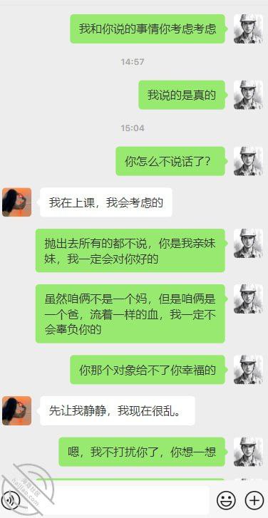 自从上次偷看到妹妹自慰,精虫上脑的我直接强上了妹妹后,妹妹就对我爱答不理了。我也和妹妹说我会对她负责的,我喜欢她已经很久了,让妹妹和我在一起,不要和那个黄毛处对象了。妹妹也没有正面回答我,而且更不会像以前一样对我有说有笑了,感觉就像是变了一个人一样,这次强上不知道是对还是错呢?下面是我较早之前偷拍妹妹换衣服的视频,还有我和妹妹的对话。请各位海友给小弟支个招吧。