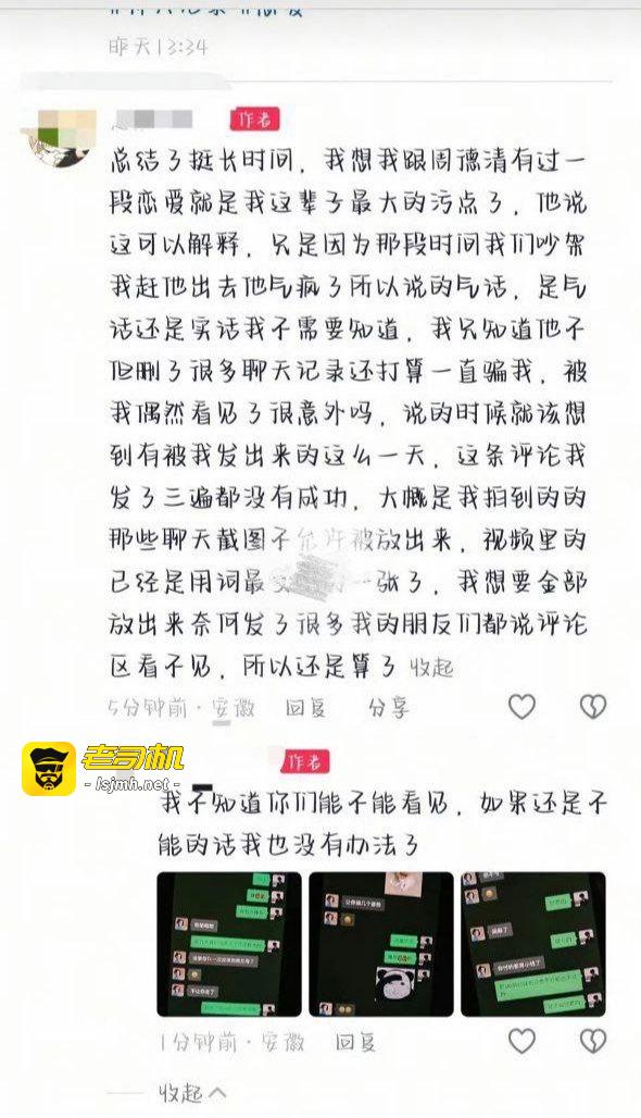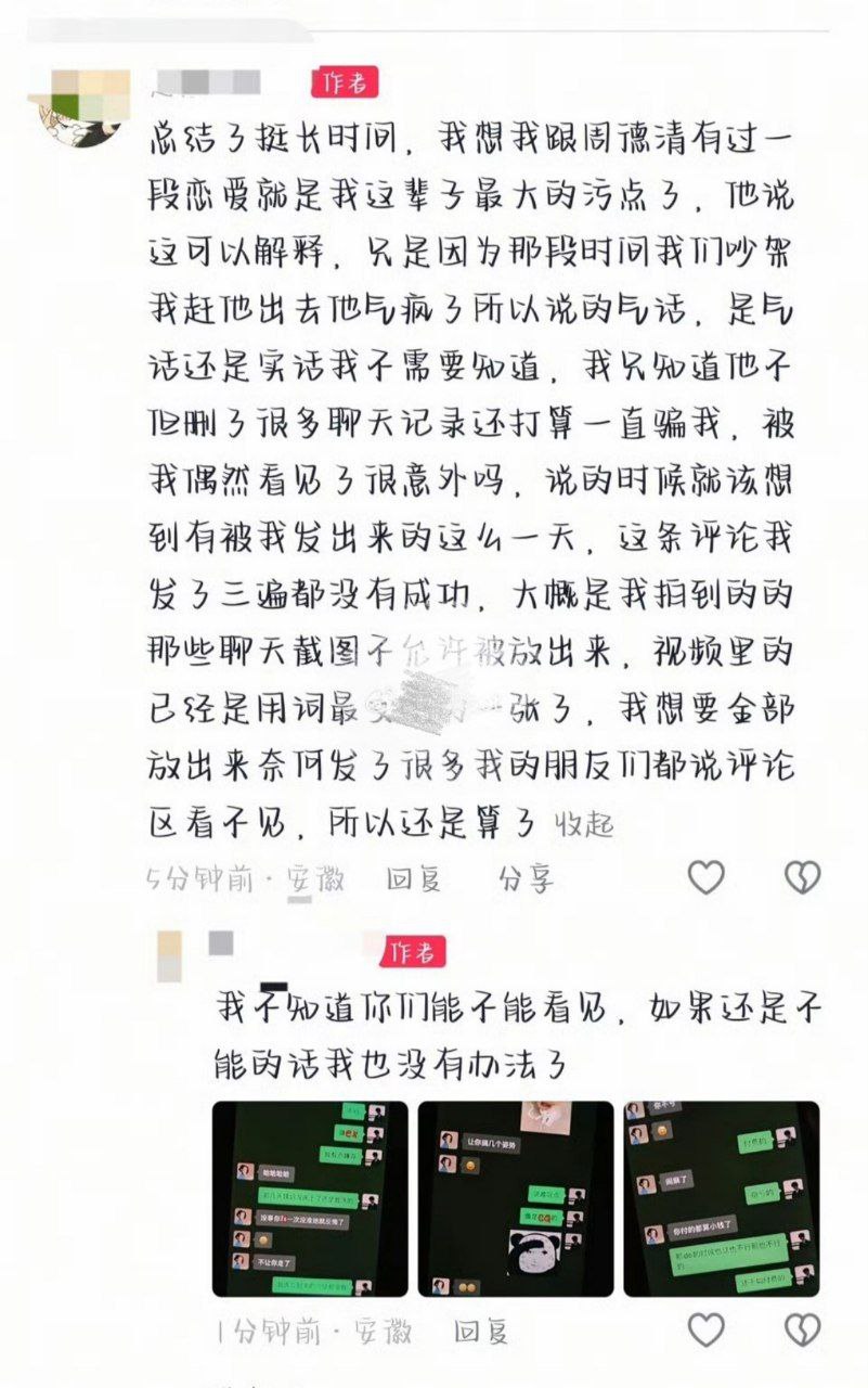 总结了挺长时间,我想我跟周德清有过一段恋爱就是我这辈子最大的污点了,他说这可以解释,只是因为那段时间我们吵架我赶他出去他气疯了所以说的气话,是气话还是实话我不需要知道,我只知道他不他删了很多聊天记录还打算一直骗我,被我偶然看见了很意外吗,说的时候就该想到有被我发出来的这么一天,这条评论我发了三遍都没有成功,大慨是我拍到的的那些聊天截图不能许被放出来,视频里的已经是用词最张了,我想要金部