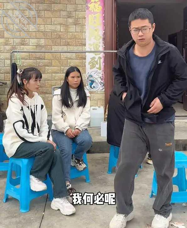 妻子穿着白色卫衣和牛仔裤,低头坐在小板凳上,摆弄着衣角,看不清表情。岳母则坐在正中的椅子上,腰板挺直,神情严肃。