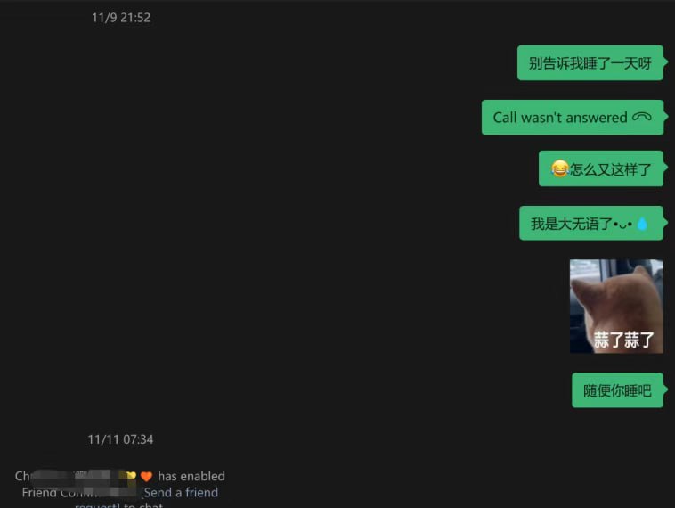 在她10月份回到国内之后,我们仍然经常保持着高频联系:视频、语音、电话都没断过。之前我们常常会聊到很晚,其实不是因为无聊,而是我一直在用这种方式确认:我们还在同一段关系里。