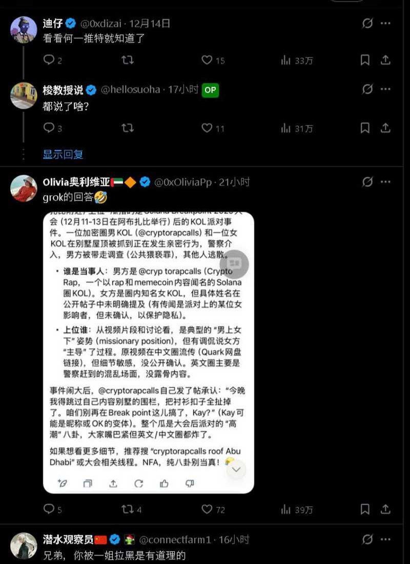 圈各大社群被一条劲爆大瓜刷屏:传言前币安CEO CZ在迪拜参加大会期间,疑似出轨某外籍美女KOL 更有看热闹不嫌事大的项目方火速上线了嘲讽意味极强的绿帽何一代币,引得无数散户围观跟风 一时间,关于币安“帝后”感情破裂的传闻甚嚣尘上!经多方核实,网传视频的真实情况与CZ毫无关系,实则是一名国外KOL在迪拜公共场所因涉嫌实施公开猥亵而被警方介入处理! 有传言说加密皇帝在迪拜开会的时候,临幸了某知名女KOL,被皇后捉奸在床,一眼假的内容传的到处都是,甚至还有人用AI合成了照片视频,要是一姐是外行人,大表哥估计都要跪搓衣板了!